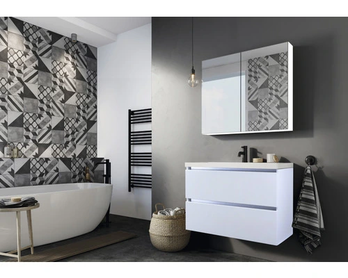 Badkamermeubelset Vogue 100 Cm 2 Kraangaten Incl. Spiegelkast Dubbelzijdig Gespiegeld Wit Hoogglans